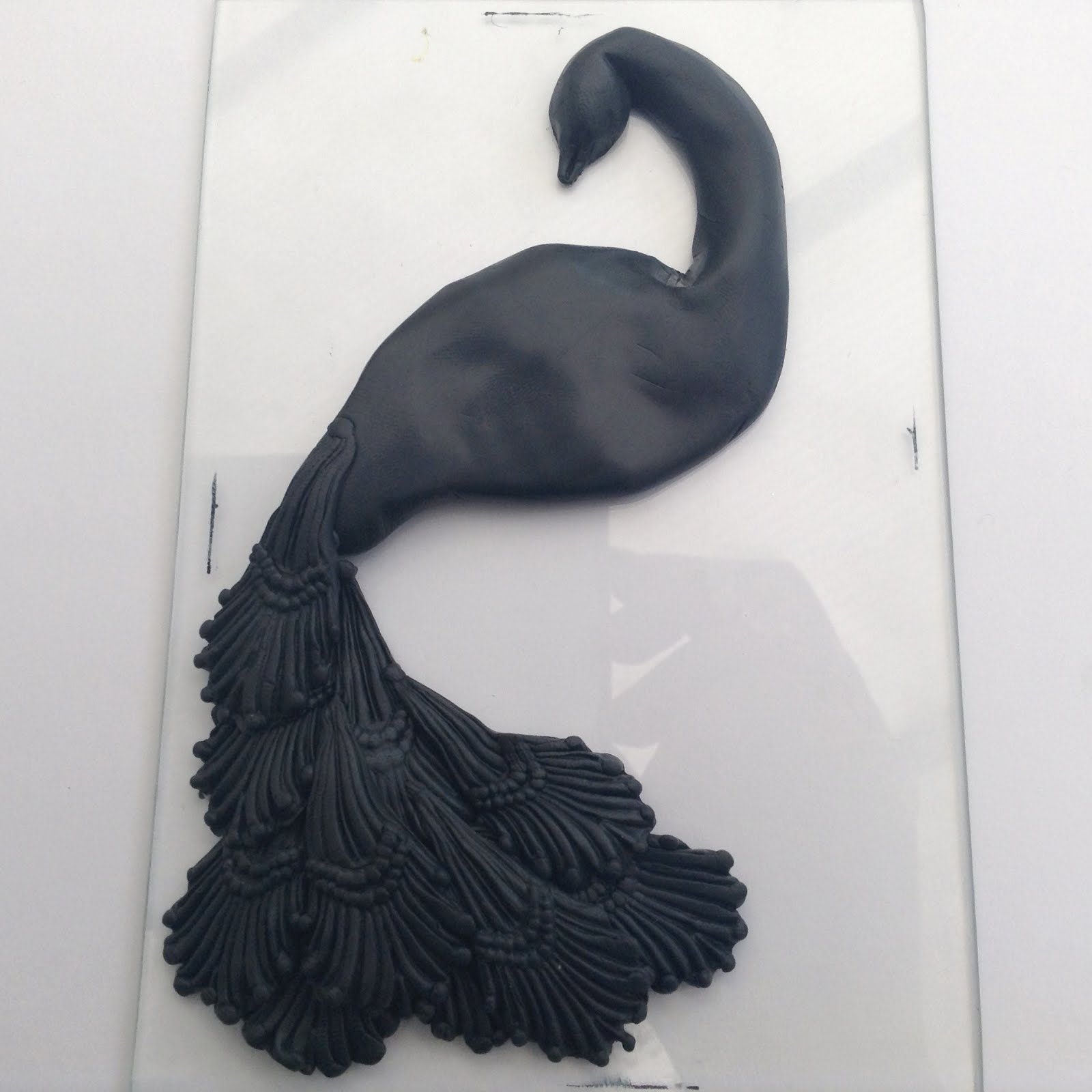 Once textured place this clay sheet back on the glass and cut to size. Remember to leave a small border around the edge. Carefully place your Peacock back in place and press him down a little to stick. Now you need to make him a couple of legs and I used the