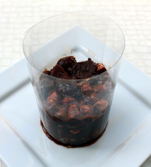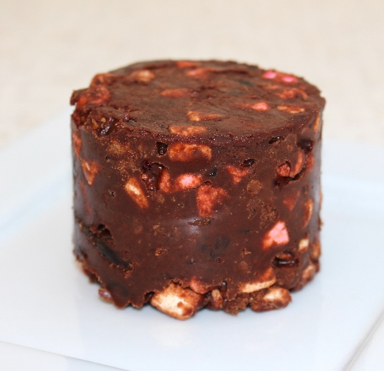 Make up the rocky road mixture and press into your cake tin which has been lined with parchment paper. If you don’t have a cake tin the right size, cut the A4 sheet of acetate in half lengthways and roll one half up to form a tube approximately 7cm wide and secure with sticky tape. Place the tube on top of a flat plate and press the rocky road mixture inside. Pack it down well so it forms a good round shape with a flat top. It should be about 4cm tall. See yesterday’s blog post.