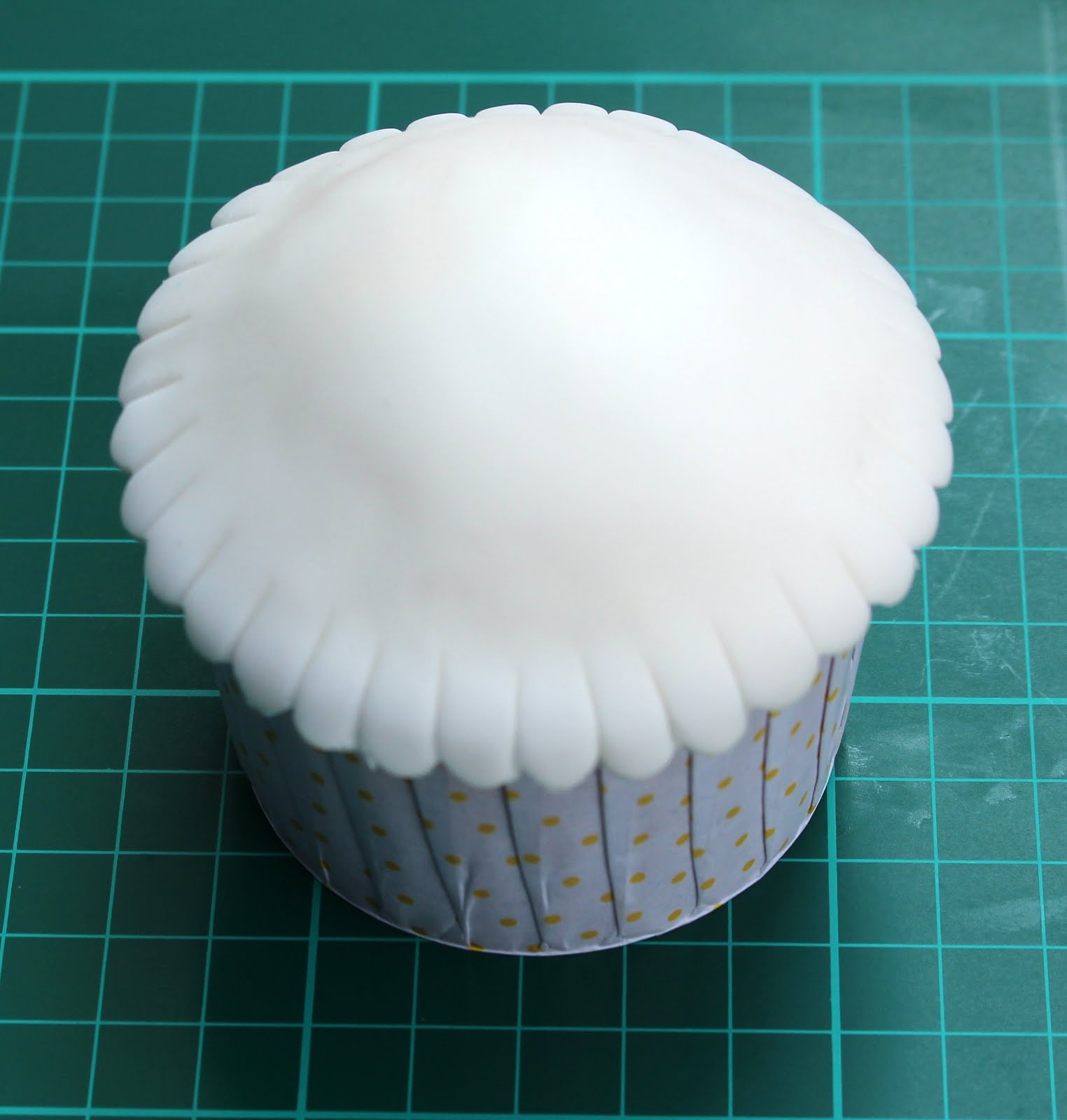 Place the white fondant circle over the buttercream dome (if your buttercream is very soft you can refrigerate it first) – it should slightly overlap the cupcake.
