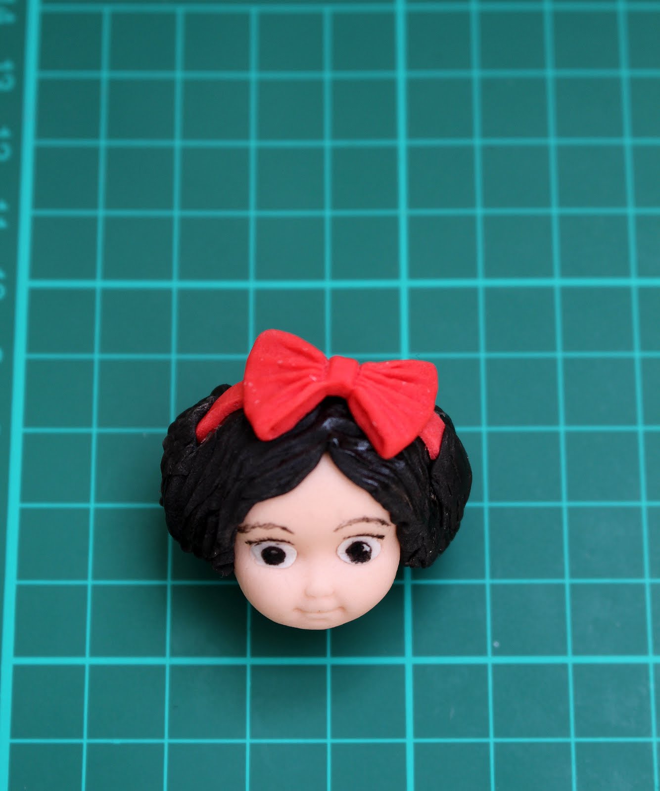 Here is a top shot of the head, you can see that the hair band doesn’t go right across the head. Also I added some food glaze to the hair to make it nice and shiny.
