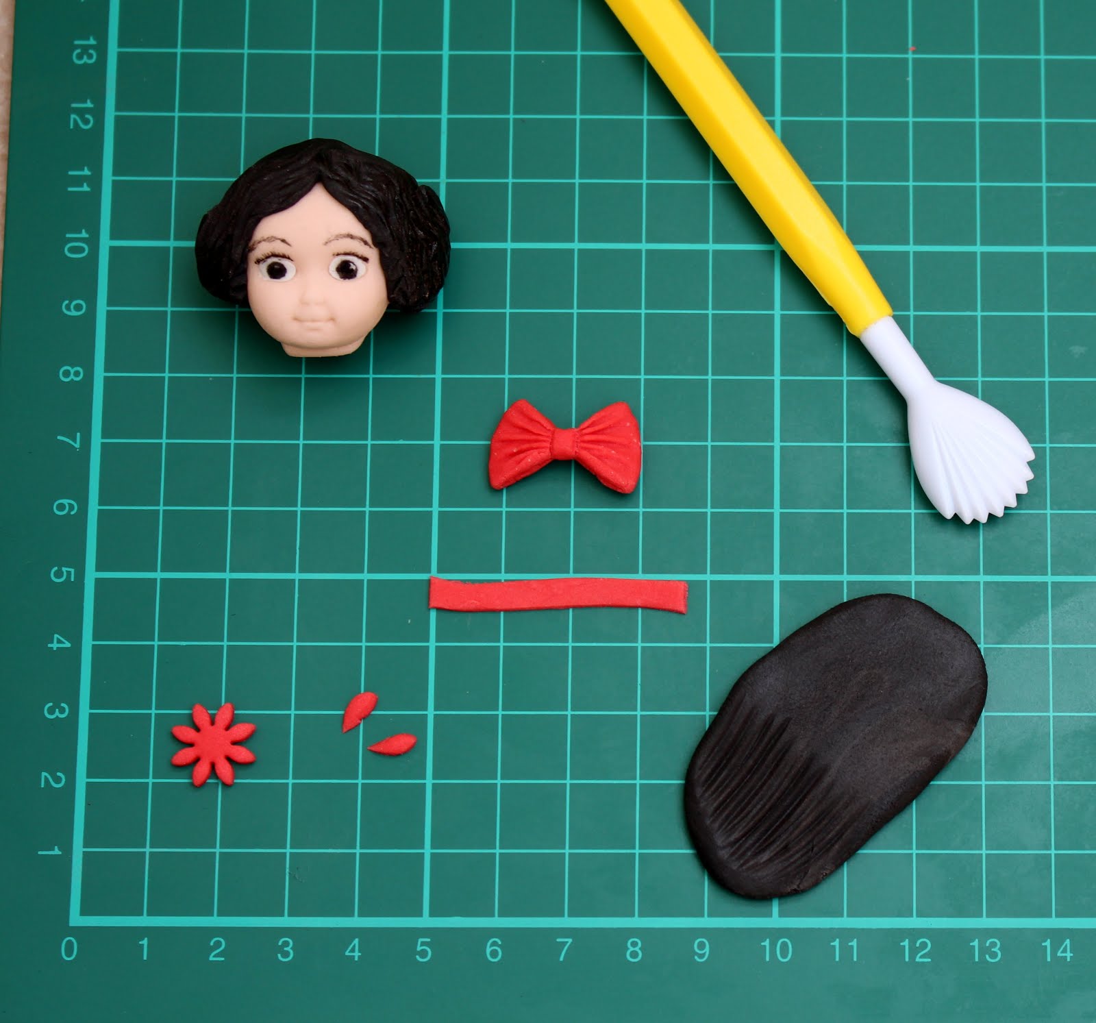 Using the head made from the Katy Sue Designs head mould, add in the eye details with a black edible marker pen. Roll out some black fondant for the hair and with a shell or dresden tool create the strands of the hair. Apply to the head and reshape until you get the desired hairstyle. Make a red bow and a strip of red fondant for the hair band. Cut out the petals from a small daisy in red fondant to decorate the sleeves of the dress.
