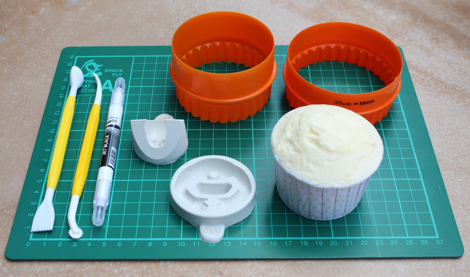 You will need a domed cupcake, a fluted cutter slightly larger than the diameter of your cupcake, a round cutter, a head and some arms made out of flesh coloured modelling paste using the Katy Sue Designs moulds, a black edible pen, a dresden tool, a shell tool, a small daisy cutter, some white, black, red, yellow and navy blue fondant.